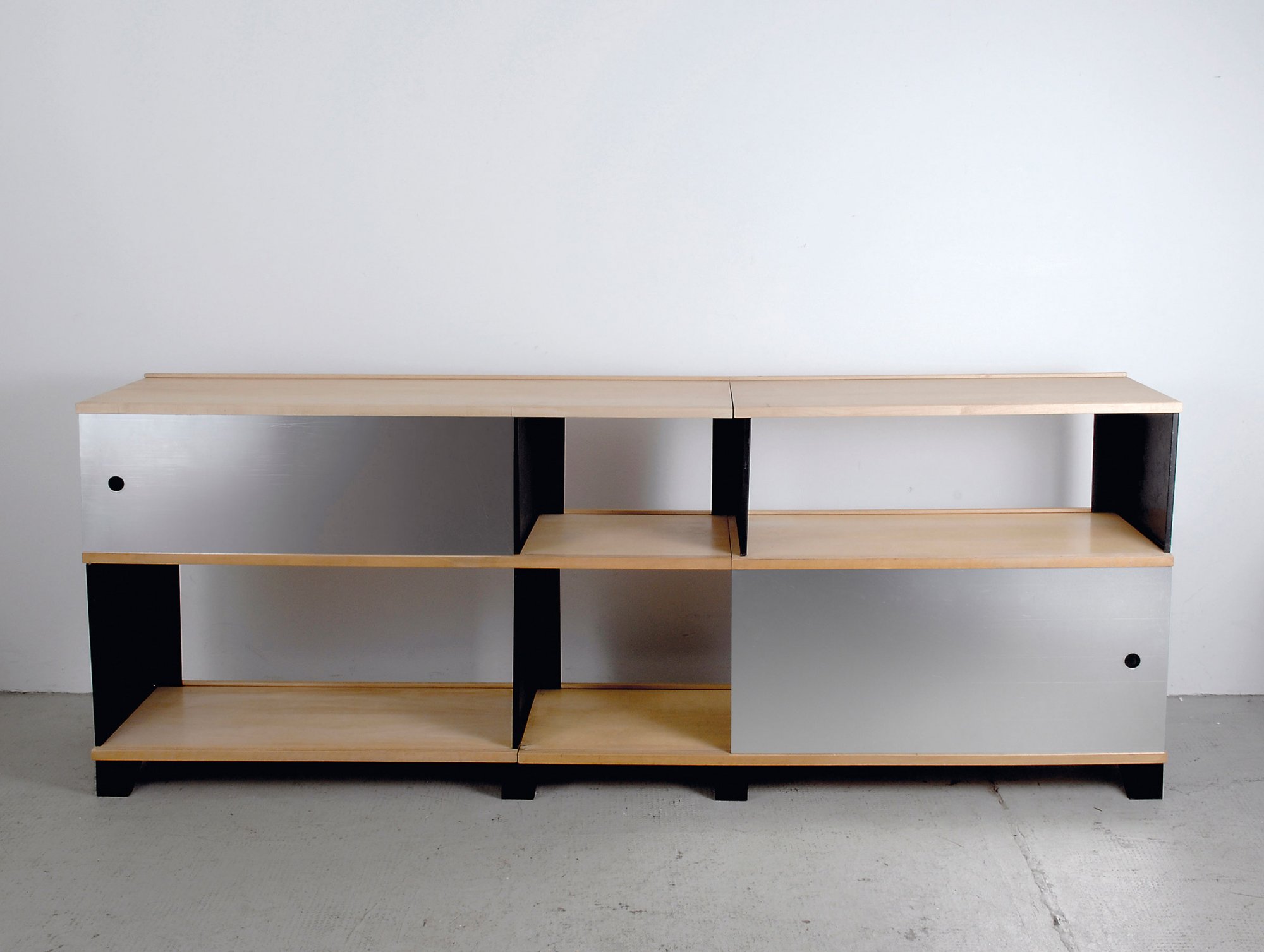 Reni Shulman-Trüdinger. 'Typ II' bookshelf, designed in 1956. H. 77 x 200.5 x 30.5 cm. Made by Wohnhilfe, Zurich. Chipboard with beech veneer, sheet steel, painted black, sliding doors of aluminium sheet.