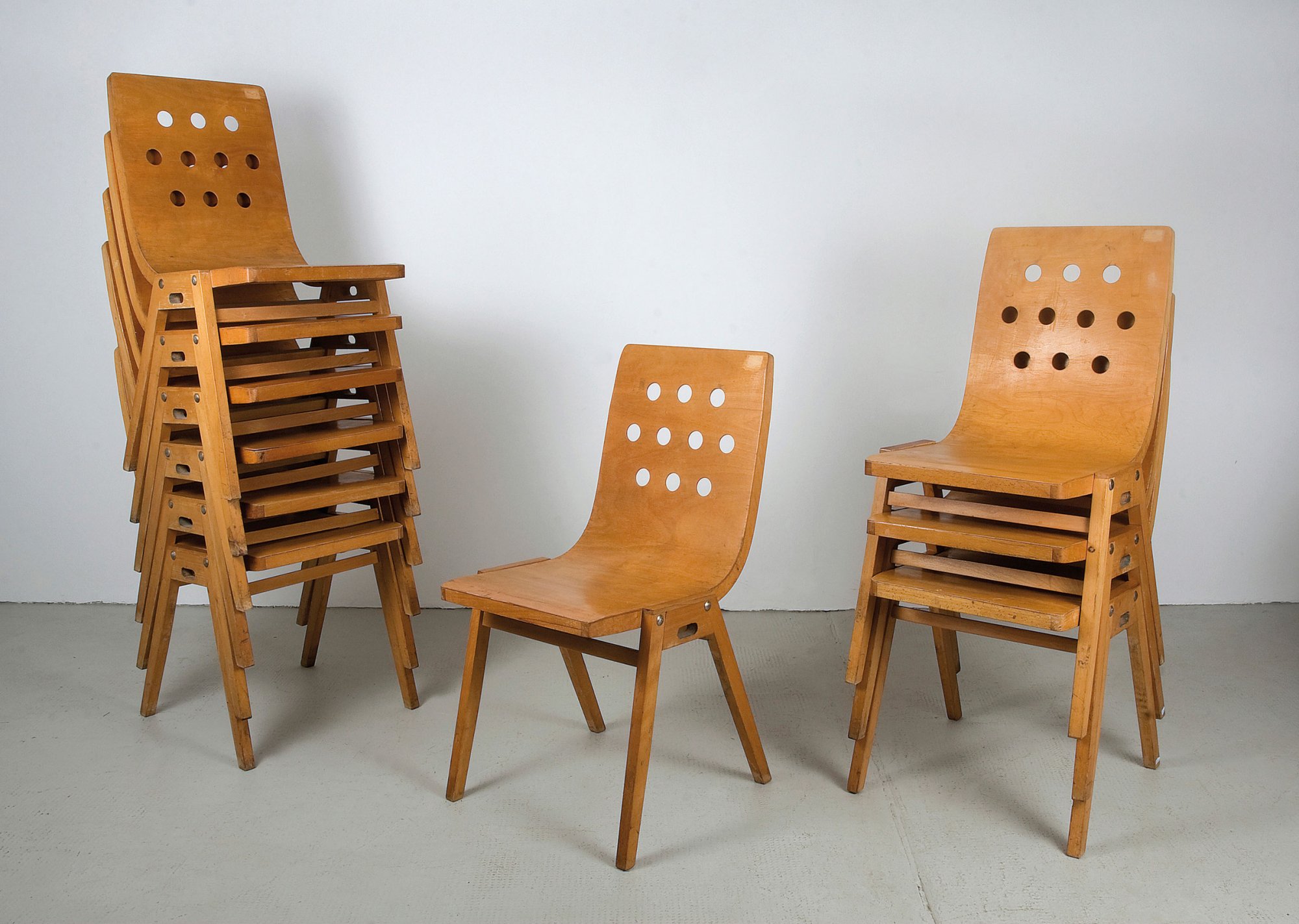Roland Rainer. Ten 'City Hall - 3-4-3' chairs, designed in 1951. H. 85 x 44.5 x 58 cm. Made by E. & A. Pollak, Vienna. Beechwood, plywood.