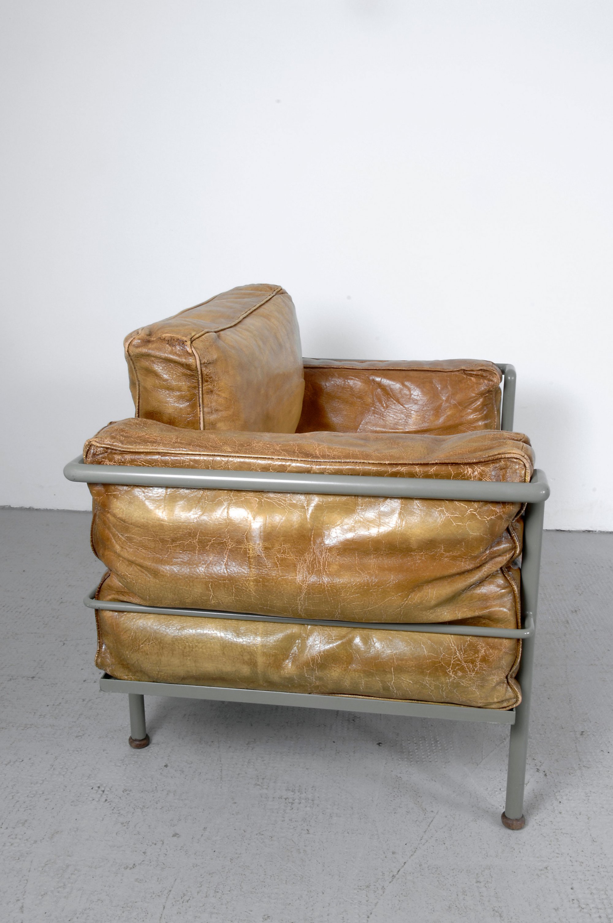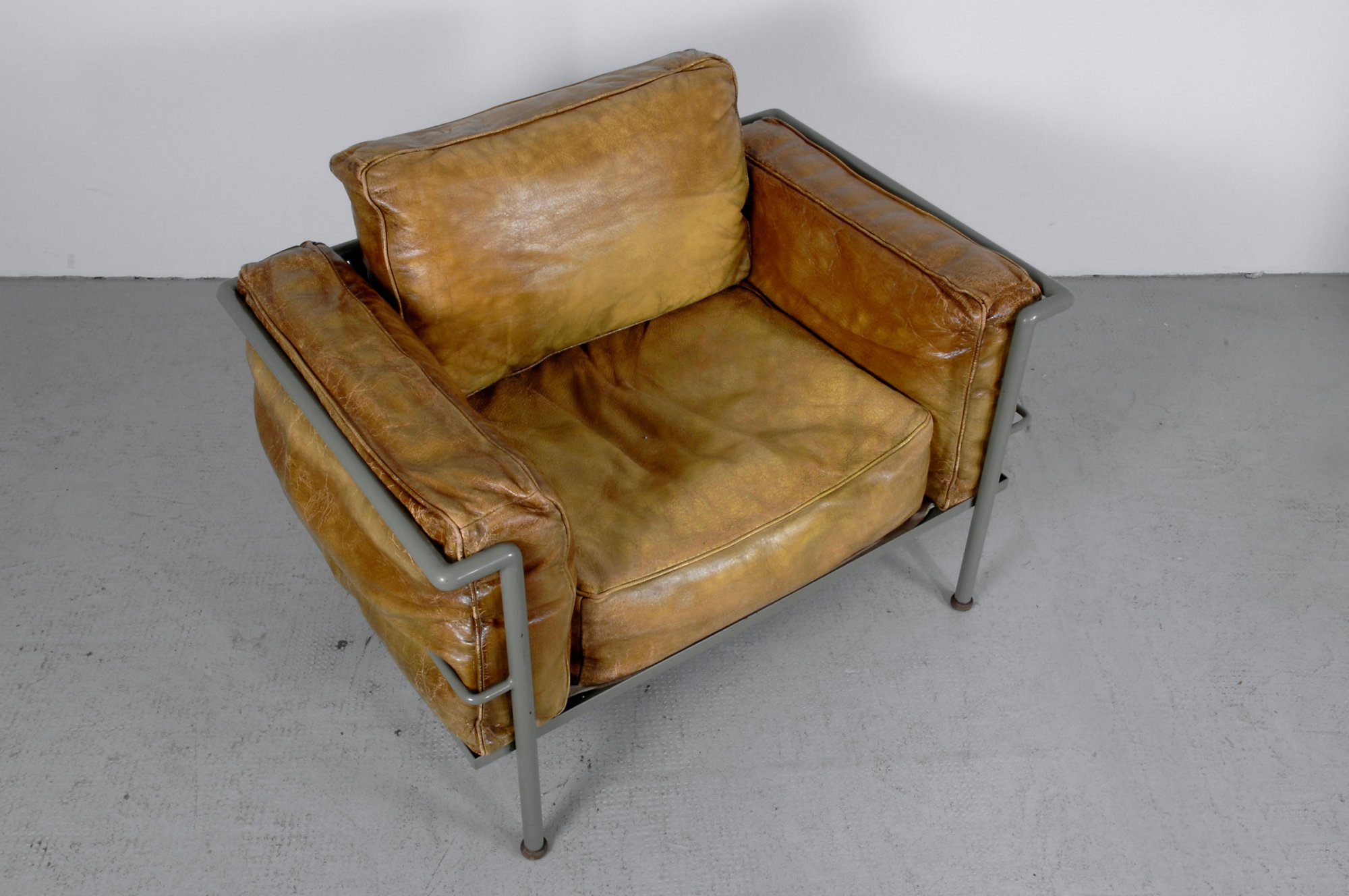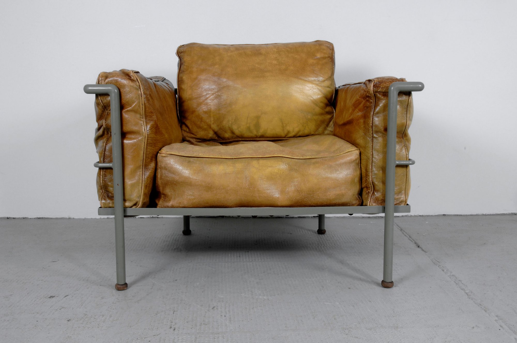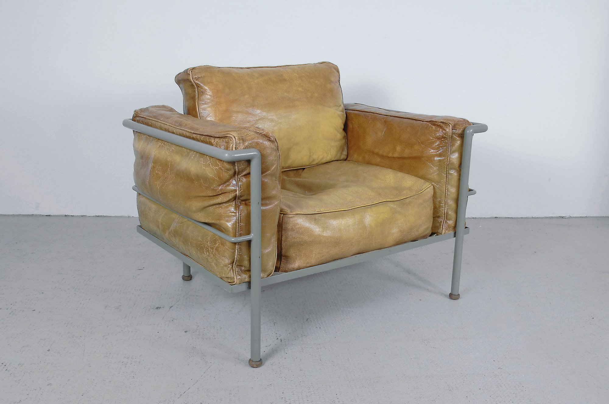 Le Corbusier; Charlotte Perriand; Pierre Jeanneret.'Grand Confort' - 'LC-2', designed in 1928. H. 54.5 x 93 x 64 cm. Manufacturer unknown. Tubular steel, painted grey, mustard-yellow leather, upholstery of horsehair and down.