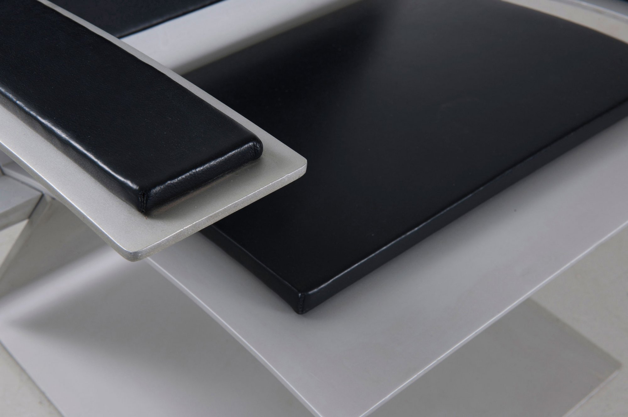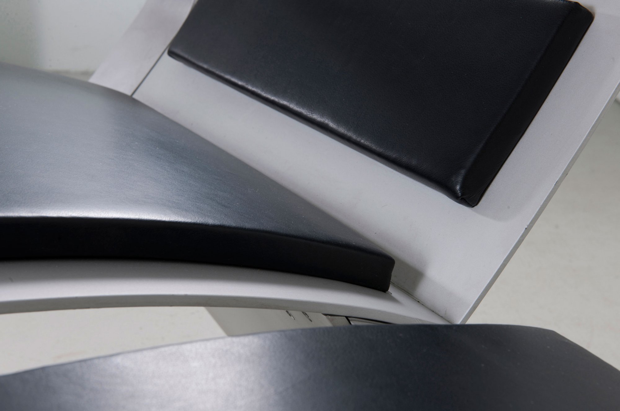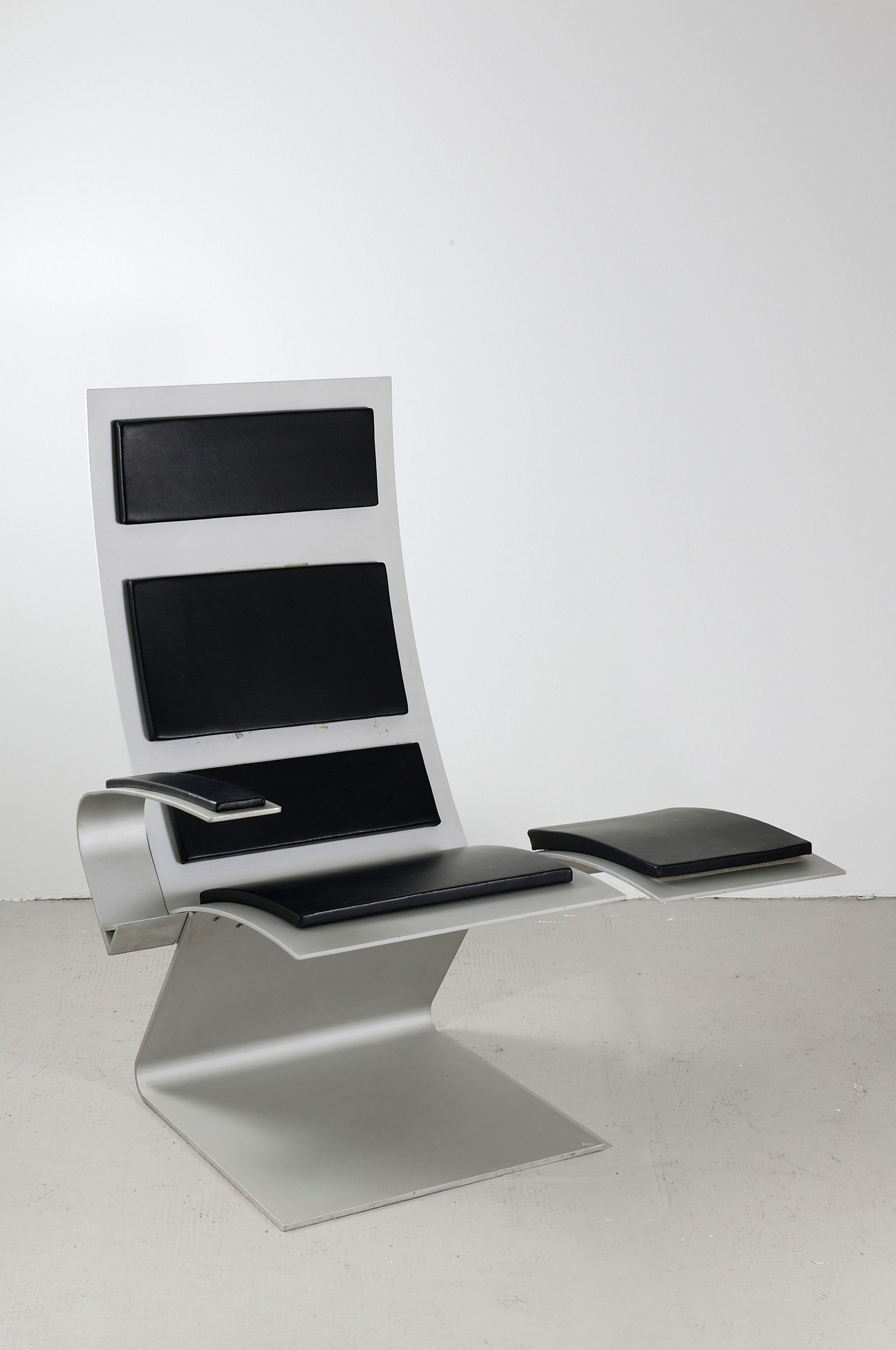 Werner Sobek. Prototype 'Airport chair'with tray, designed in 2000. H. 123.5 x 117.5 x 68 cm. Made made Hardwork, Stuttgart. Aluminium sheet, black leather.
